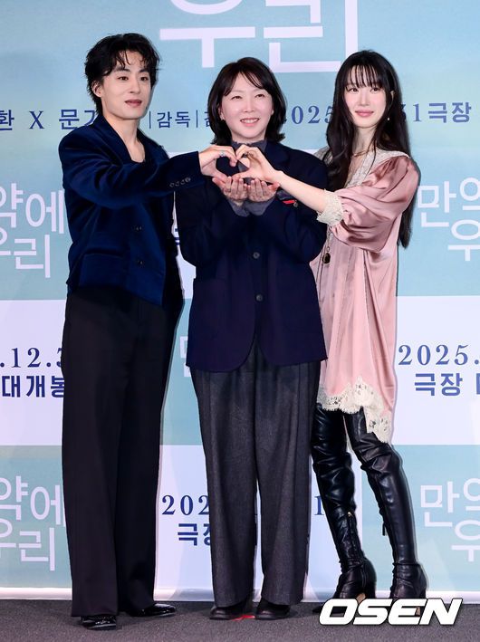 18일 오후 서울 CGV 용산아이파크몰에서 영화 ‘만약에 우리’ 언론시사회&기자간담회가 열렸다. 배우 구교환, 문가영이 출연하는 ‘만약에 우리'는 뜨겁게 사랑했던 은호와 정원이 10년 만에 우연히 재회하며 기억의 흔적을 펼쳐보는 현실공감연애. 배우 구교환, 김도영 감독, 배우 문가영이 포토타임을 하고 있다. 2025.12.8 /jpnews@osen.co.k