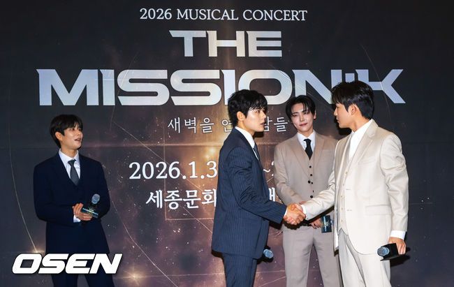 5일 서울 중구 한국프레스센터에서 뮤지컬 더 미션:K 기자간담회가 진행됐다. ‘더 미션:K’는 알렌·언더우드·세브란스·에비슨 등 조선의 새벽을 연 실존 개척자 네 명의 이야기를 토크쇼 형식의 K-POP 뮤지컬 콘서트로 재해석한 작품으로, MJ(아스트로), 재윤(SF9), 리키(틴탑), 김동준(ZE:A)이 주연으로 무대에 선다. 재윤과 MJ, 리키, 김동준이