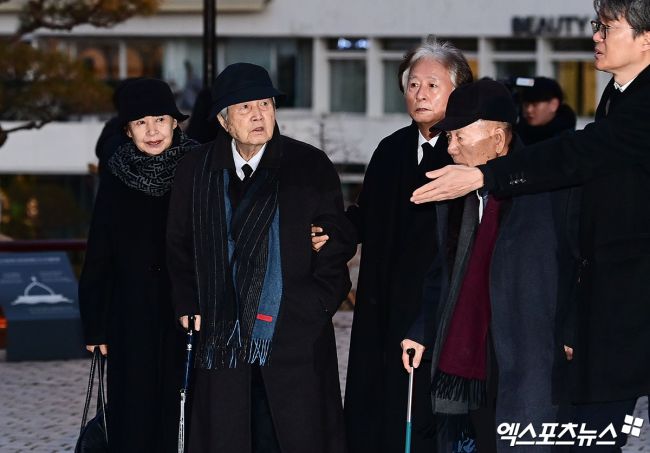 9일 오전 서울 명동성당에서 故 안성기 배우의 장례 미사와 영결식이 엄수됐다. 이날 미사에 참석한 임권택 감독, 배우 채령 부부와 김종수, 김동호 전 부산국제영화제 집행위원장이 발걸음을 옮기고 있다. 박지영 기자 jypark@xportsnews.com