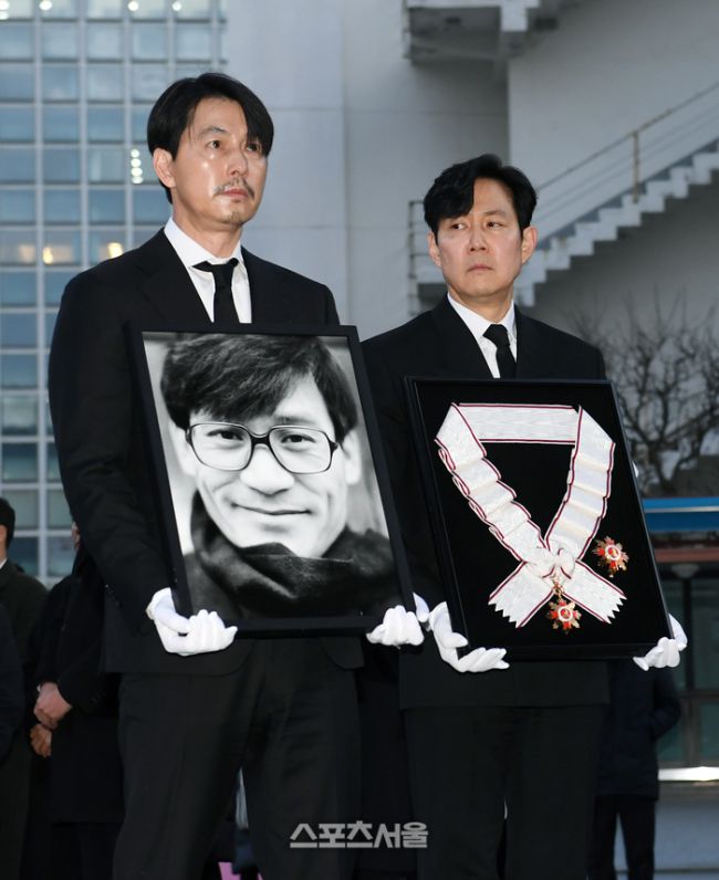 배우 정우성(왼쪽)과 이정재가 9일 서울 중구 명동성당에서 진행된 장례미사를 위해 영정과 금관문화훈장을 들고 대성전으로 입장하고 있다. 운구는 설경구, 조우진, 주지훈, 박해일, 박철민, 유지태가 맡았다. 2026. 1. 9. 박진업 기자 upandup@sportsseoul.com [기사제보 news@sportsseoul.com] Copyright ⓒ 스포