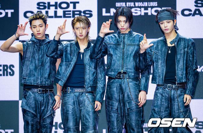 신인 보이그룹 롱샷(LNGSHOT) 데뷔 쇼케이스 삿콜러스(SHOT CALLERS)가 13일 오후 서울 영등포구 명화라이브홀에서 열렸다. 오율, 률, 우진, 루이로 구성된 롱샷은 박재범이 설립한 레이블 모어비전에서 선보이는 첫 보이그룹으로 주목을 받았다. 무대 위에서 롱샷이 포토타임을 하고 있다. 2026.01.13 / rumi@osen.co.kr