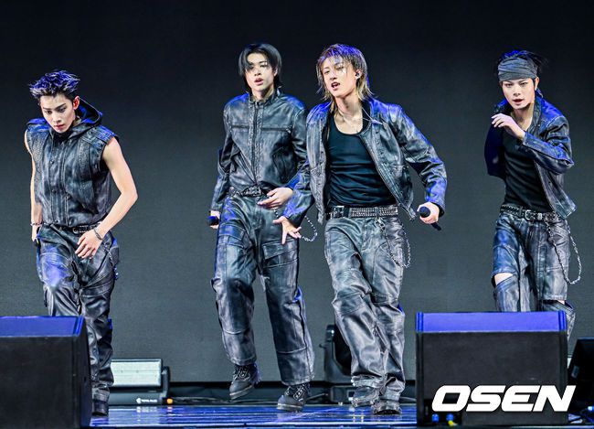 신인 보이그룹 롱샷(LNGSHOT) 데뷔 쇼케이스 삿콜러스(SHOT CALLERS)가 13일 오후 서울 영등포구 명화라이브홀에서 열렸다. 오율, 률, 우진, 루이로 구성된 롱샷은 박재범이 설립한 레이블 모어비전에서 선보이는 첫 보이그룹으로 주목을 받았다. 무대 위에서 롱샷이 화려한 무대를 선보이고 있다. 2026.01.13 / rumi@osen.co.kr