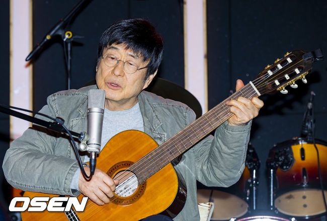 27일 오후 서울 종로구 복합문화공간 에무 '팡타개러지'에서 김창완밴드 신곡 'Seventy' 발매 기자간담회가 진행됐다. 김창완(보컬), 이상훈(키보드), 최원식(베이스), 강윤기(드럼), 염민열(기타) 5인 구성의 김창완밴드의 새 싱글 'Seventy'는 지난 2016년 '시간' 이후 10년 만에 공개하는 신작이다. 김창완이 무대를 펼치고 있다. 202
