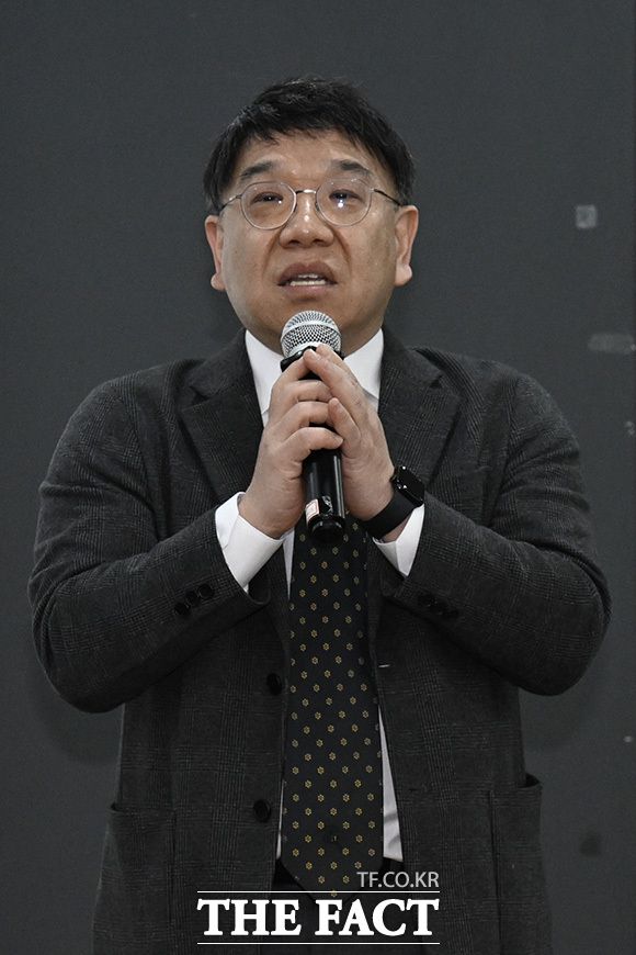 민희진 오케이레코즈 대표(전 어도어 대표)의 소송대리인인 법무법인 지암 김선웅 변호사가 25일 오후 서울 종로구 교원챌린지홀에서 열린 기자회견에 참석해 입장을 밝히고 있다. 민 대표는 이 자리에서 "저는 256억원을 다른 가치와 바꾸기로 결정했다"며 "거액의 돈보다 간절히 바라는 가치가 있기에 하이브에 의미 있는 제안을 하고자 이 자리에 섰다"고 말했다.