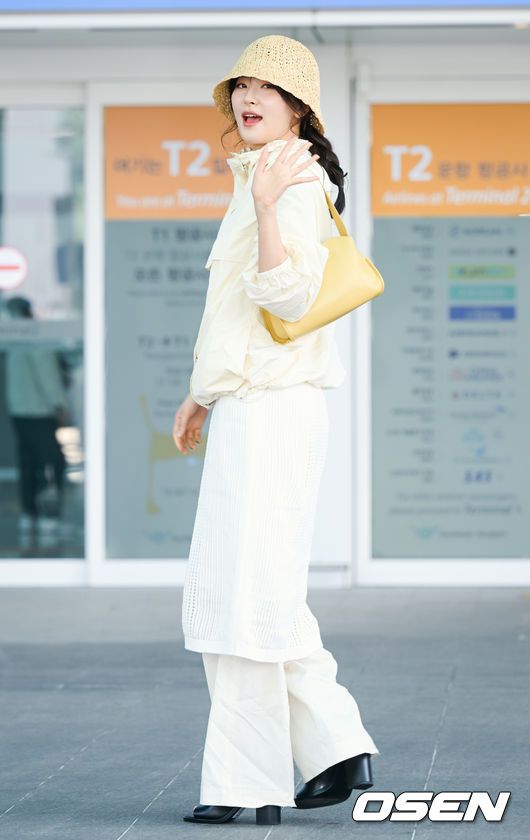 레드벨벳(Red Velvet) 슬기가 17일 인천국제공항을 통해 화보 촬영 차 인도네시아로 출국했다. 이날 슬기는 화이트 패션에 노란색 모자와 가방으로 산뜻한 봄 패션을 연출했다. 레드벨벳 슬기가 출국장으로 향하고 있다. 2026.03.17 /cej@osen.co.kr