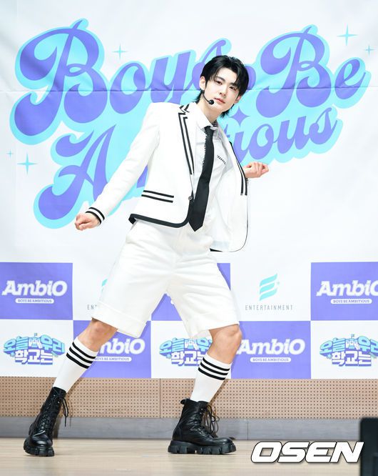 그룹 엠비오의 데뷔 앨범 발매 기념 웹예능 ‘오늘 우리 학교는’ 현장 공개 행사가 서울 세그루패션디자인고등학교 강당에서 열렸다. 엠비오는 같은날 정오 첫 번째 미니앨범 '보이즈 비 앰비셔스(Boys be Ambitious)’를 발매한다. 엠비오 루원이 포즈를 취하고 있다. 2026.03.18 /cej@osen.co.kr