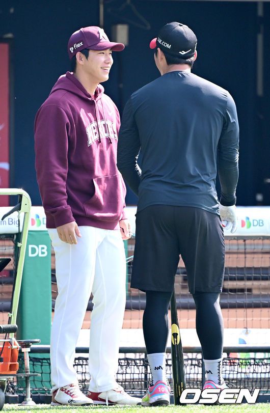 23일 서울 잠실야구장에서 ‘2026 신한 SOL KBO리그’ LG 트윈스와 키움 히어로즈의 시범경기가 열린다. 시범경기는오는 24일까지 각 팀당 12경기씩 총 60경기가 펼쳐진다. 경기를 앞두고 키움 이주형과 LG 오지환이 대화를 나누고 있다. 2026.03.23 / dreamer@osen.co.kr