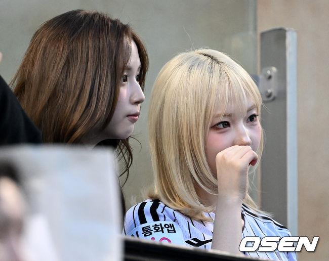 16일 서울 잠실야구장에서 2026 신한 SOL KBO리그 LG 트윈스와 롯데 자이언츠의 경기가 열렸다. 이날 LG는 치리노스, 롯데는 로드리게스를 선발로 내세웠다. 그룹 트리플에스 지우, 하연이 경기를 바라보고 있다. 2026.04.16 /sunday@osen.co.kr
