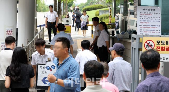 윤석열 전 대통령의 부인 김건희 여사의 구속영장실질심사를 하루 앞둔 11일 서울 서초구 서울중앙지방법원에서 직원들이 출입자 소지품 검사를 하고 있다. 김 여사가 연루된 각종 의혹을 수사하는 특별검사팀(특별검사 민중기)은 구속영장에 자본시장법 위반과 정치자금법 위반, 특정법죄가중법상 알선수재 등의 혐의를 구속영장에 적시했다.