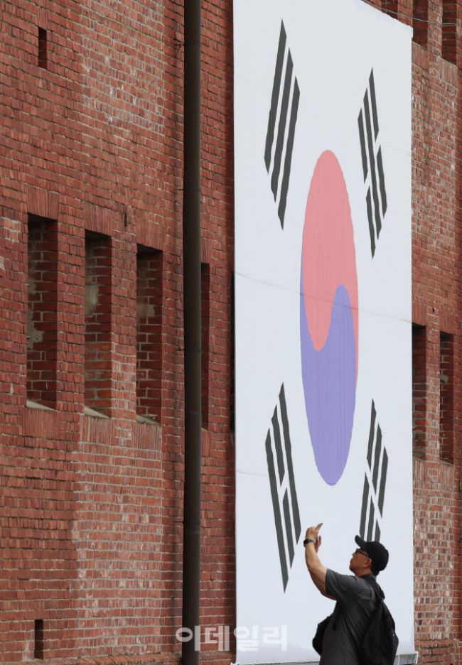 80주년 광복절을 하루 앞둔 14일 서울 서대문형무소역사관에서 대형 태극기 앞에서 한시민이 사진을 찍고 있다.