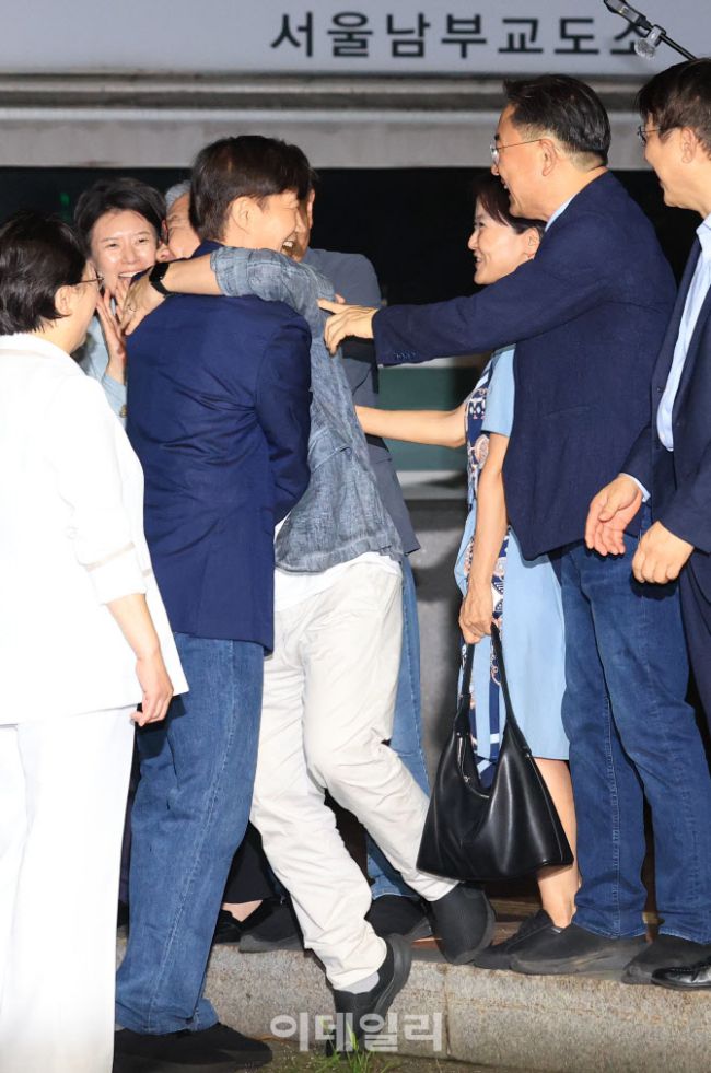 조국 조국혁신당 전 대표가 이재명 정부의 광복절 특별사면으로 15일 자정 서울 구로구 서울남부교도소에서 출소, 사면된 최강욱 전 더불어민주당 의원과 포옹하고 있다.
