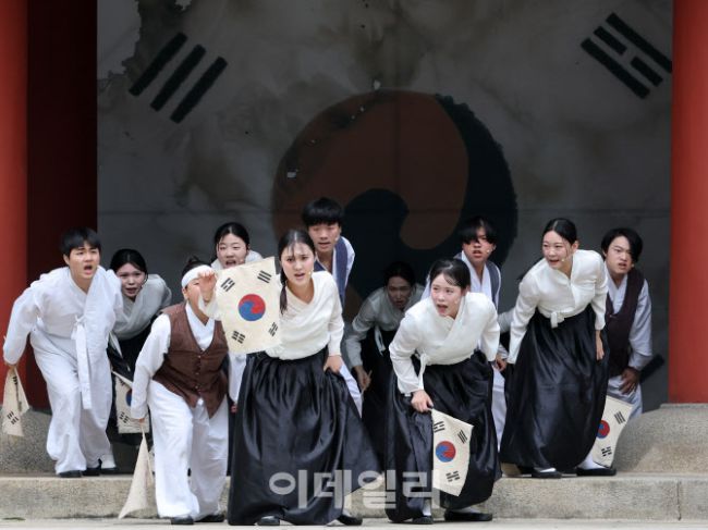 15일 서울 종로구 보신각에서 열린 '제80주년 광복절 기념 타종행사'에서 학생들이 멋진 공연을 선보이고 있다.