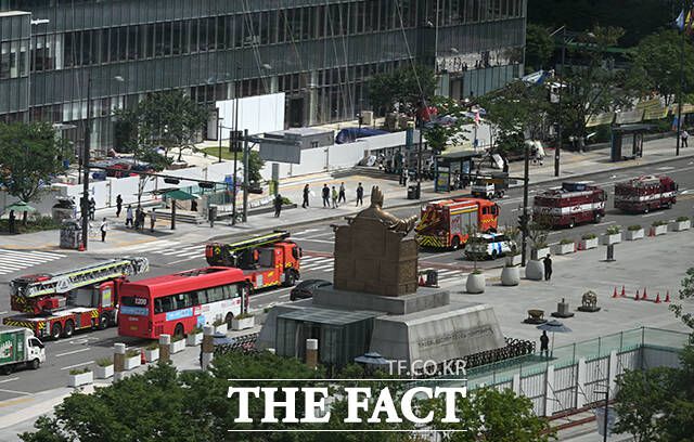 을지연습과 연계한 전국 동시 민방위 훈련이 실시된 20일 오후 서울 종로구 광화문광장 세종대왕상 앞으로 소방차 길터주기 훈련이 진행되고 있다. darkroom@tf.co.kr 사진영상기획부 photo@tf.co.kr 발로 뛰는 더팩트는 24시간 여러분의 제보를 기다립니다. ▶카카오톡: '더팩트제보' 검색 ▶이메일: jebo@tf.co.kr ▶뉴스 홈페이지: