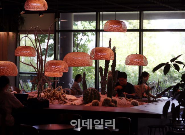 초가을 길목에서 아침과 저녁엔 선선해 졌지만 한낮 기온이 33도의 폭염이 이어지고 있는 가운데 3일 서울 강서구 서울식물원을 찾은 시민들이 카페에서 휴식을 취하고 있다.
