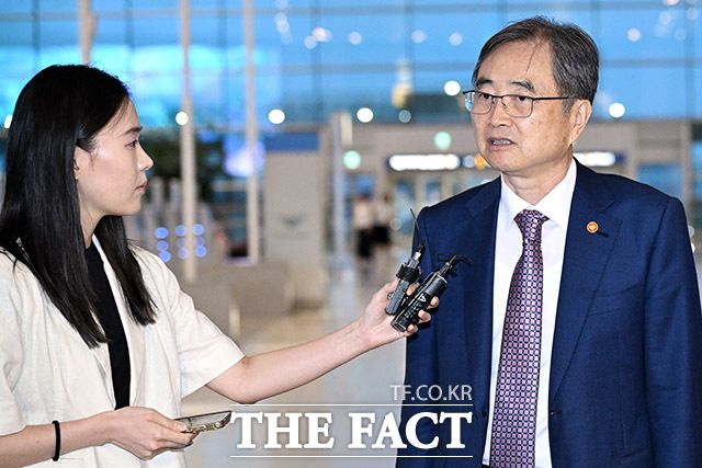 방미 전 취재진 질문에 답하는 조현 장관 [포토]