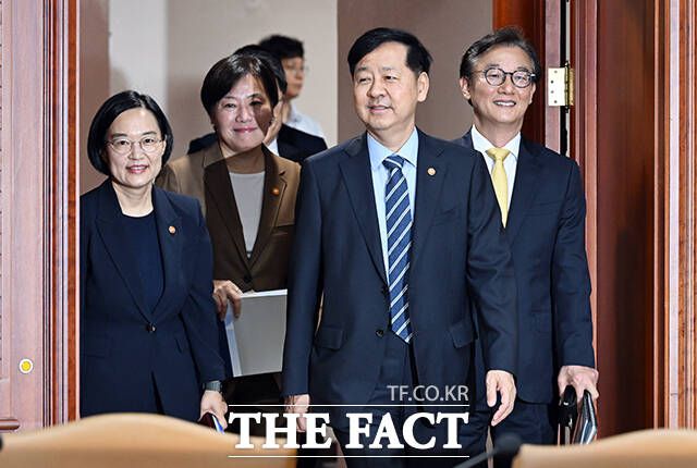 구윤철 부총리 겸 기획재정부 장관(가운데)과 송미령 농림축산식품부 장관, 전재수 해양수산부 장관, 한성숙 중소벤처기업부 장관이 10일 오전 서울 종로구 정부서울청사에서 열린 성정전략TF 겸 산업경쟁력강화 관계장관회의에 참석하고 있다. darkroom@tf.co.kr 사진영상기획부 photo@tf.co.kr 발로 뛰는 더팩트는 24시간 여러분의 제보를 기다립