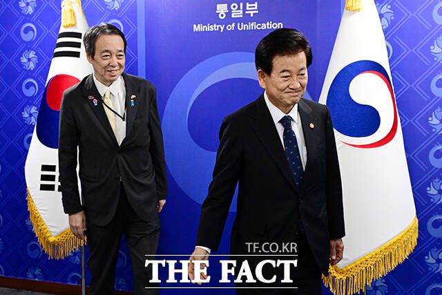 접견 장소로 이동하는 정동영 통일부 장관과 미즈시마 코이치 주한일본대사 [포토]