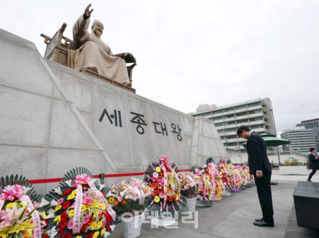 [포토]한글날 맞아 세종대왕 동상에 헌화하는 최휘영 문체부 장관