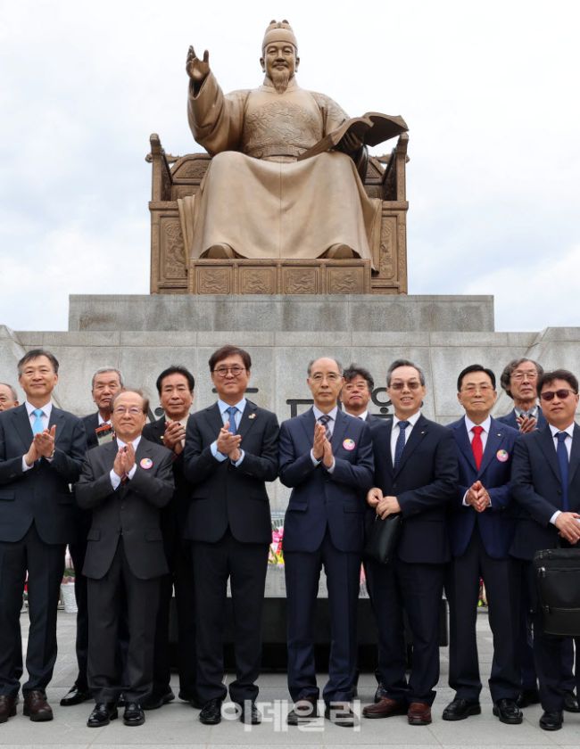 [포토]한글날 맞아 세종대왕 동상앞에 모인 최휘영 문체부 장관과 한글 관련 단체장들