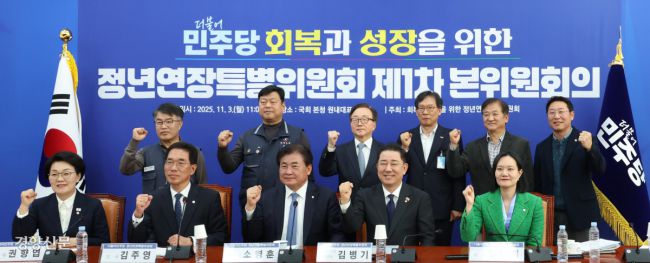 김병기 더불어민주당 원내대표(앞줄 오른쪽)가 3일 국회에서 열린 정년연장특별위원회 제1차 본위원회의에서 소병훈 위원장(앞줄 왼쪽) 등 참석자들과 기념촬영을 하고 있다. 한수빈 기자 subinhann@kyunghyang.com ▶ 매일 라이브 경향티비, 재밌고 효과빠른 시사 소화제! ▶ 더보기|이 뉴스, 여기서 끝나지 않습니다 → 점선면 ©경향신문(www.k