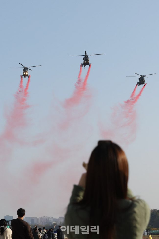 7일 경기도 고양시 덕양구 한국항공대학교 활주로에서 열린 '제1회 항공레저산업 일자리 박람회'에서 헬기 편대의 축하비행이 이어지고 있다.