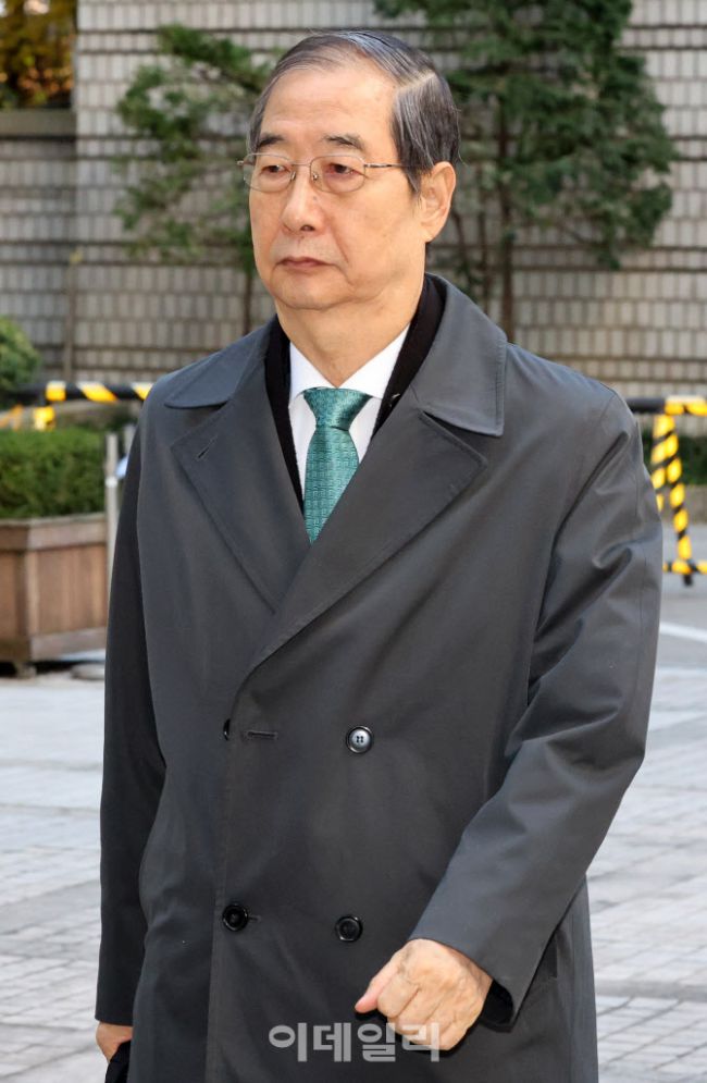 윤석열 전 대통령의 12·3 비상계엄을 적극적으로 말리지 않은 혐의로 재판에 넘겨진 한덕수 전 국무총리가 12일 서울 서초구 서울중앙지방법원에서 열린 내란 우두머리 종사 혐의 1심 속행 공판에 출석하고 있다.