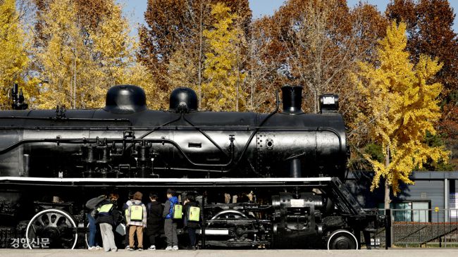 은행잎 색 가방 메고 ‘기차 구경’[포토뉴스]