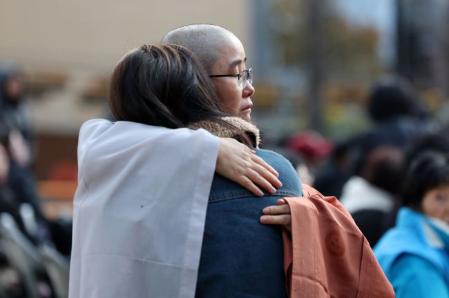 산재사망 희생자 추모 위령재가 18일 오후 서울 종로구 조계사에서 열려 스님이 헌화를 마친 유가족을 안아주며 위로하고 있다. 김영원 기자 forever@hani.co.kr 칼바람보다 차가운 이별에 위로가 되는 말이 있을까. 일하다가 갑자기 곁을 떠난 가족의 빈 자리는 몇 해가 지나도 채워질 수 없다. 그럼에도 불구하고 유가족 곁을 함께 지켜주는 뜨거운 마음
