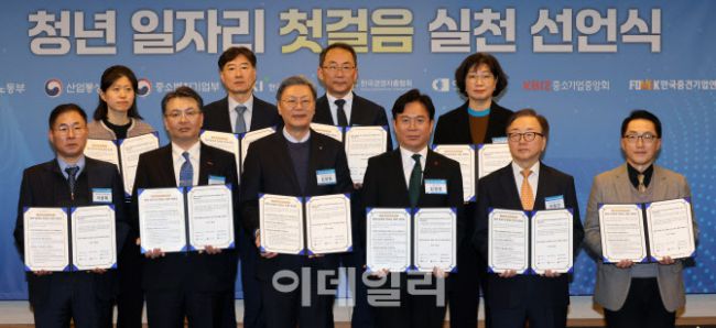 김영훈 고용노동부 장관을 비롯한 참석자들이 8일 서울 중구 프레스센터에서 열린 청년 일자리 첫걸음 실천 선언식에서 기념촬영을 하고 있다. 이날 선언식에는 김 장관, 김창범 한국경제인협회 상근부회장, 이동근 한국경영자총협회 상근부회장, 이상복 대한상공회의소 인력개발사업단장, 오기웅 중소기업중앙회 상근부회장, 이호준 한국중견기업연합회 상근부회장이 참석했다.