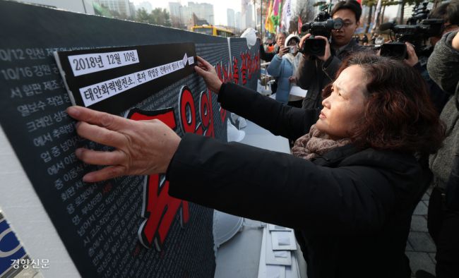 충남 태안화력발전소에서 끼임 사고로 숨진 김용균씨의 7주기인 10일 서울 용산구 대통령실 앞에서 열린 ‘김용균 7주기 추모결의대회’에서 어머니 김미숙 김용균재단 이사장이 사망사고 사례를 부착하고 있다. 권도현 기자 lightroad@kyunghyang.com ▶ 매일 라이브 경향티비, 재밌고 효과빠른 시사 소화제! ▶ 더보기|이 뉴스, 여기서 끝나지 않습니