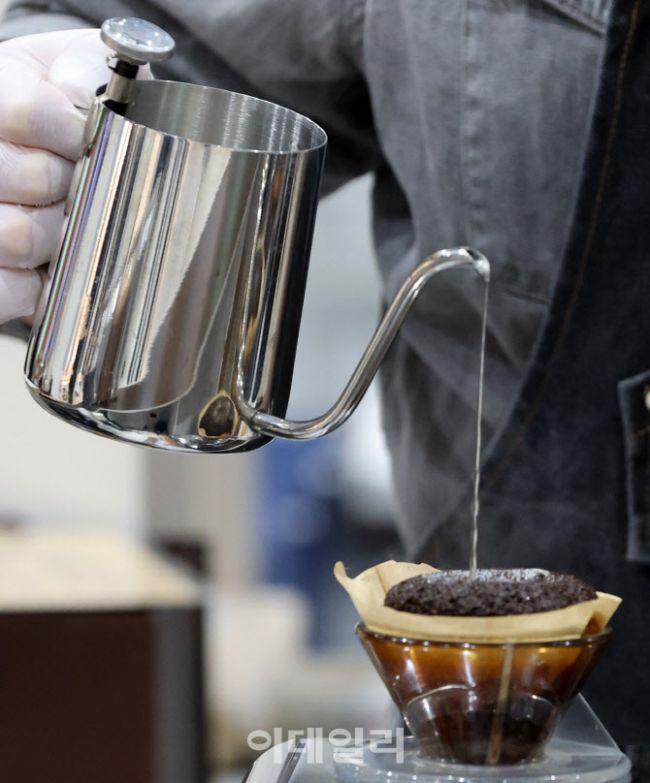 11일 서울 강서구 코엑스 마곡에서 열린 '2025 서울 카페&베이커리 페어 in 마곡'에서 부스 관계자가 핸드 드립 커피를 내리고 있다.