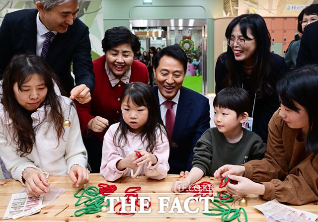 오세훈 서울시장이 12일 서울 강서구 서울키즈플라자 개관식에 참석해 어린이들의 체험활동을 살펴보고 있다. 서울시는 강서구 화곡역과 우장산역 인근에 지하 1층~지상 4층(연면적 3,779㎡) 규모로 ‘서울 키즈플라자’를 조성·완료하고 이날 정식 개관식을 가졌다. '서울 키즈플라자’는 놀이, 돌봄, 마음건강 기능을 한 건물 안에 집약시킨 통합 거점 시설로, 지