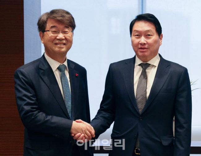 최태원 대한상공회의소 회장과 김지형 경제사회노동위원회 위원장이 16일 서울 중구 대한상의에서 간담회에 앞서 기념촬영을 하고 있다.