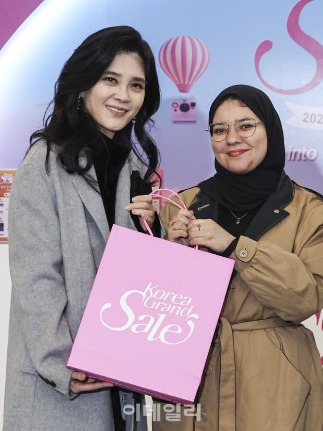 이부진 한국방문의해위원회 위원장이 17일 서울 중구 코리아그랜드세일 웰컴센터에서 외국인 방문객에게 기념품을 증정 후 기념사진을 찍고 있다. 코리아그랜드세일은 항공·숙박·쇼핑·식음·체험·편의 서비스 등 다양한 분야의 민간 참여를 바탕으로 2011년부터 이어져 온 한국의 대표 쇼핑관광축제이다.