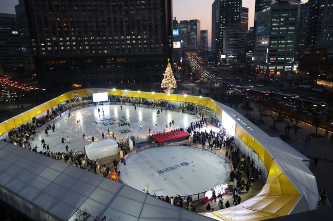 19일 개장한 서울광장 스케이트장에서 시민들이 스케이트를 타고 있다. 연합뉴스 서울광장 스케이트장이 19일 오후 5시 개장식을 시작으로 내년 2월 8일까지 총 52일간 운영에 들어간다. 서울시는 올해 서울광장 스케이트장은 ‘윈터링’(Winter Ring)을 주제로 노란색 빛을 담은 마름모 형태의 링 구조물로 감싸 밝고 경쾌한 분위기로 새롭게 단장해 경쾌한