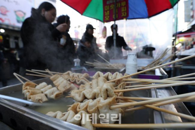찬 공기가 남하하면서 아침 기온이 큰 폭으로 낮아져 최저 기온 -6~5도로 추운 겨울 날씨를 보인 21일 서울 한 시장에서 시민들이 어묵을 먹고 있다.