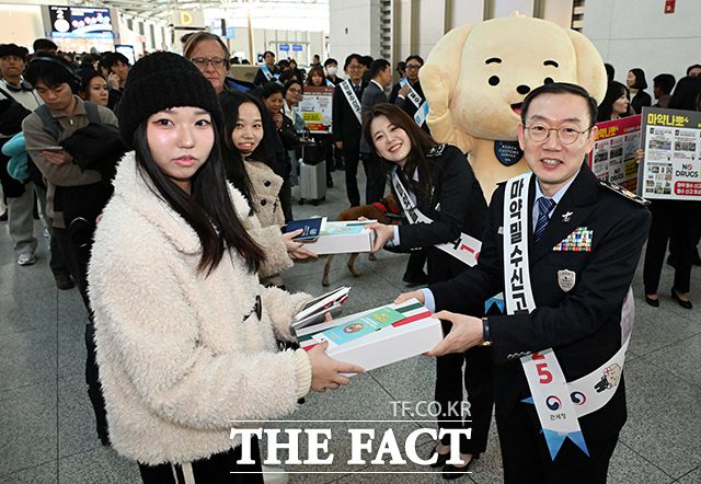 이명구 관세청장(오른쪽)과 관세청 마약근절 홍보대사를 맡은 개그우먼 김승혜가 22일 오전 인천국제공항 제1여객터미널에서 '마약밀수 근절'을 위한 캠페인으로 공항 이용객에게 선물과 안내문을 전달하고 있다. ilty012@tf.co.kr 사진영상기획부 photo@tf.co.kr 발로 뛰는 더팩트는 24시간 여러분의 제보를 기다립니다. ▶카카오톡: '더팩트제보'