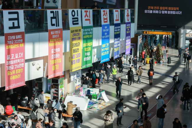 23일로 예고된 철도노조 총파업을 하루 앞둔 22일 서울역 대합실에 코레일 자회사인 코레일네트웍스 노조의 요구사항이 담긴 현수막이 걸려 있다. 성동훈 기자 zenism@kyunghyang.com ▶ 매일 라이브 경향티비, 재밌고 효과빠른 시사 소화제! ▶ 더보기|이 뉴스, 여기서 끝나지 않습니다 → 점선면 ©경향신문(www.khan.co.kr), 무단전재