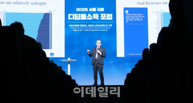 2024년 노벨경제학상 수상자 제임스 A. 로빈슨 시카고 대학교 교수가 23일 서울 동대문디자인플라자(DDP)에서 열린 '2025 서울 국제 디딤돌소득 포럼'에서 기조연설을 하고 있다. ‘미래 변화에 대응하는 새로운 소득보장제도의 구축’을 주제로 열린 ‘2025 서울 국제 디딤돌소득 포럼은 딤돌소득 관련 연구와 더불어 미래 변화에 대응하는 복지제도의 새로운