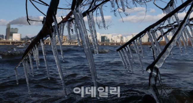 성탄절인 25일 서울 전역에 한파 특보가 내려졌다. 서울 영등포구 여의도 한강시민공원 강변에 고드름이 얼어붙어 있다.