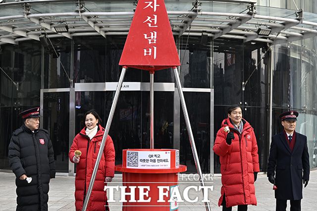 조국 조국혁신당 대표(왼쪽에서 세번째)와 이해민 조국혁신당 사무총장(왼쪽에서 두번째)이 29일 오후 서울 종로구 광화문에서 열린 구세군 자선냄비 모금 캠페인에 참석해 봉사활동을 하고 있다. 조 대표와 이해민 조국혁신당 사무총장은 오후 2시부터 약 1시간가량 봉사활동을 진행했다. 조 대표는 이날 "어린 시절부터 자선냄비를 보면 꼭 한번 직접 참석해 보고 싶었