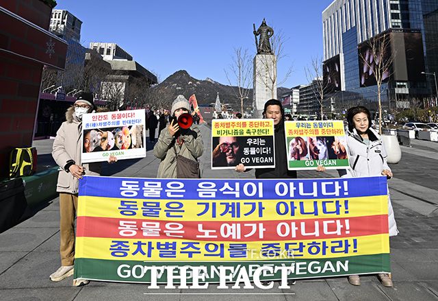 한국비건채식협회와 기후위기비건행동, 한국비건연대, 비건세상을위한시민모임, 한국채식연합 등 시민단체가 30일 오후 서울 종로구 광화문광장에서 '2026년 새해에는 비건(VEGAN) 채식하세요!' 기자회견을 열고 발언하고 있다. 이들 단체는 기자회견문을 통해 "유엔식량농업기구에 따르면 전 세계 온실가스의 13%가 교통수단에서 나오고, 축산업에선 18%에 해당하
