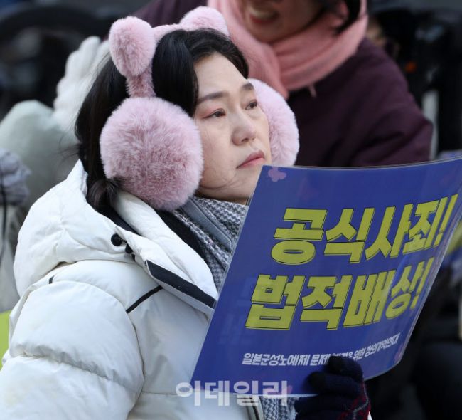 31일 서울 종로구 주한일본대사관 인근에서 열린 제1733차 '일본군성노예제 문제해결을 위한 정기 수요시위' 참가자가 공식사죄 등의 문구가 적힌 팻말을 들고 집회에 참가하고 있다.