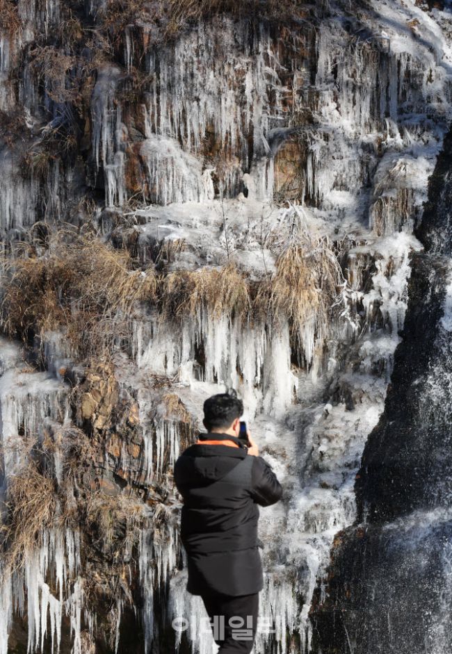 매서운 한파가 몰아치며 아침 최저기온이 영하 16도까지 떨어지는 등 강추위를 보인 1일 서울 서대문구 홍제폭포가 꽁꽁 얼어 있다.