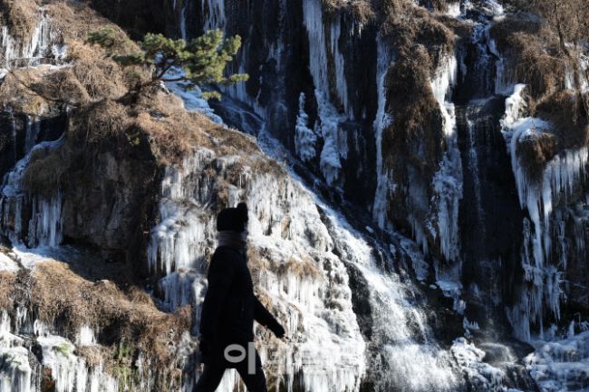 매서운 한파가 몰아치며 아침 최저기온이 영하 16도까지 떨어지는 등 강추위를 보인 1일 서울 서대문구 홍제폭포가 꽁꽁 얼어 있다.