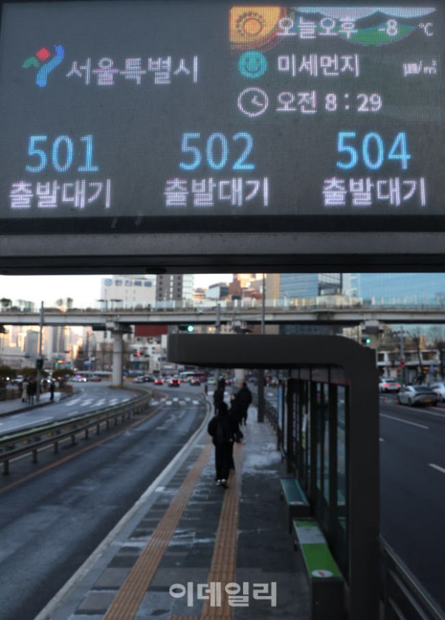 서울 시내버스 노동조합이 무기한 전면파업에 돌입에 들어간지 첫 날인 13일 서울역 버스환승센터 전광판에 각 노선버스의 위치가 '출발대기'로 표시되고 있다.