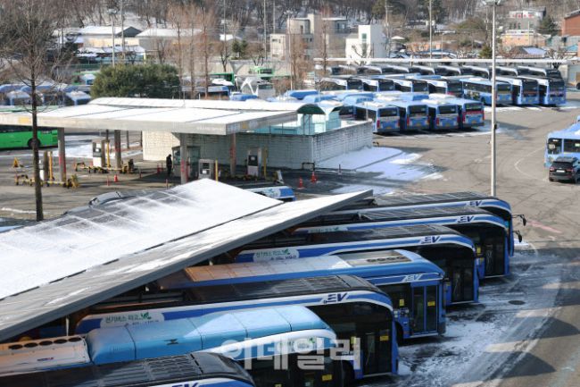 서울 시내버스 노동조합이 무기한 전면파업에 돌입한지 이틀째인 14일 서울 도봉구 한 시내버스 차고지에서 버스가 주차돼 있다.