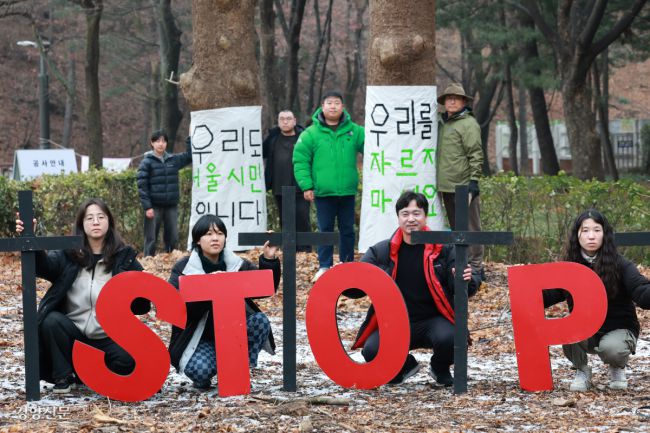 환경보건시민센터와 서울환경연합 활동가들이 15일 서울 경희궁 내 나무들이 벌목된 ‘경희궁지 생태 기후 환경숲 조성 사업’ 현장에서 벌목 중단을 촉구하는 퍼포먼스를 벌이고 있다. 정지윤 선임기자 color@kyunghyang.com ▶ 매일 라이브 경향티비, 재밌고 효과빠른 시사 소화제! ▶ 더보기|이 뉴스, 여기서 끝나지 않습니다 → 점선면 ©경향신문(ww