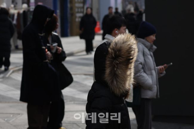 찬바람이 강해지면서 내린 눈이 얼어붙을 것으로 예상되는 19일 오후 서울 강남역 일대에서 시민들이 움츠린채 이동하고 있다.