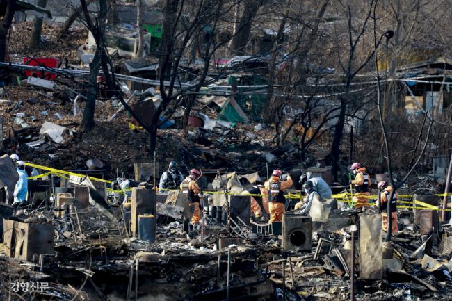 지난 16일 발생한 대형 화재로 잿더미로 변한 서울 강남구 개포동 구룡마을에서 19일 경찰과 소방, 한국전기안전공사 관계자들이 합동 감식을 진행하고 있다. 이 화재로 이재민이 129가구 181명이 발생했다. 문재원 기자 mjw@kyunghyang.com ▶ 매일 라이브 경향티비, 재밌고 효과빠른 시사 소화제! ▶ 더보기|이 뉴스, 여기서 끝나지 않습니다 →